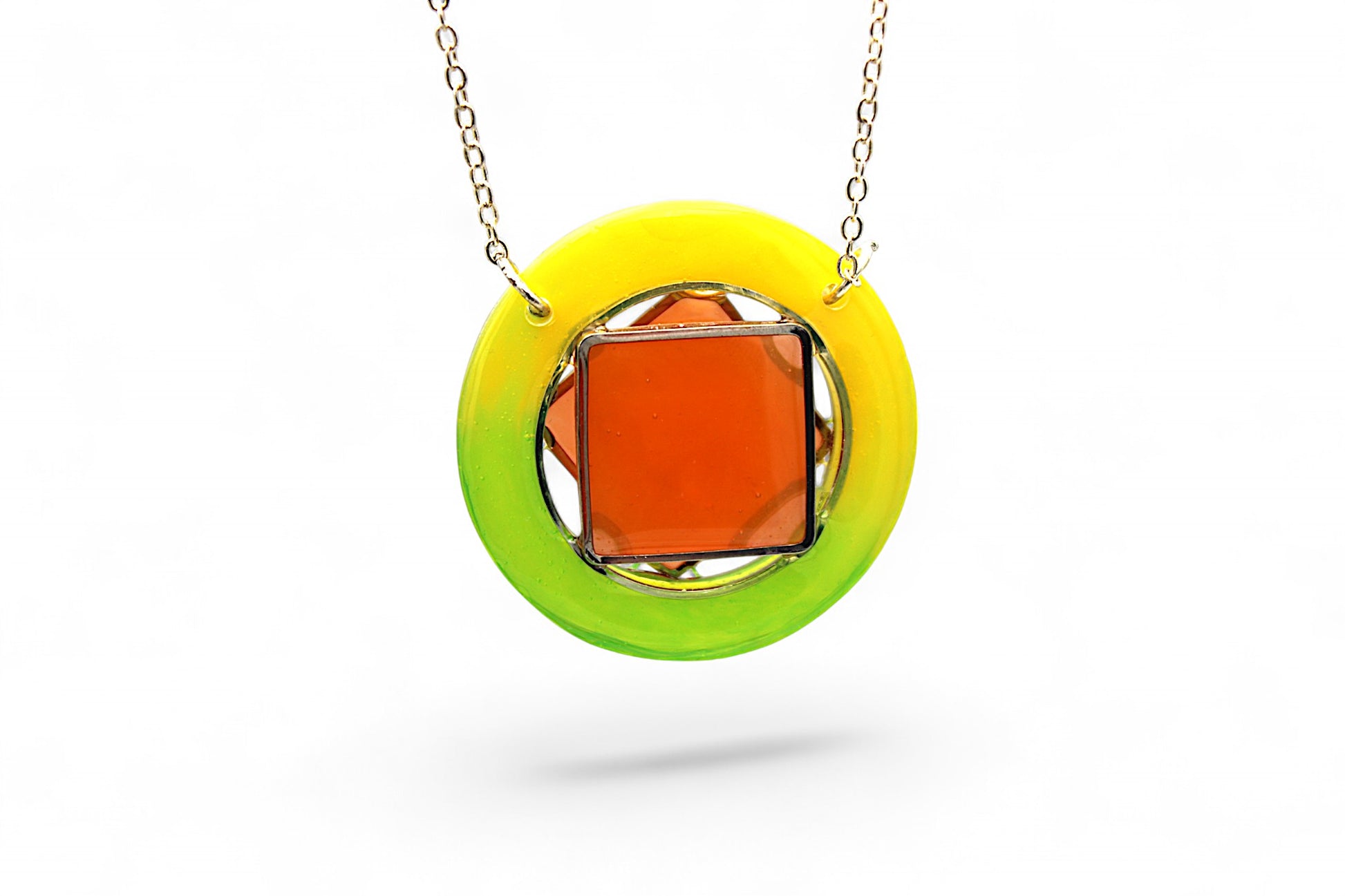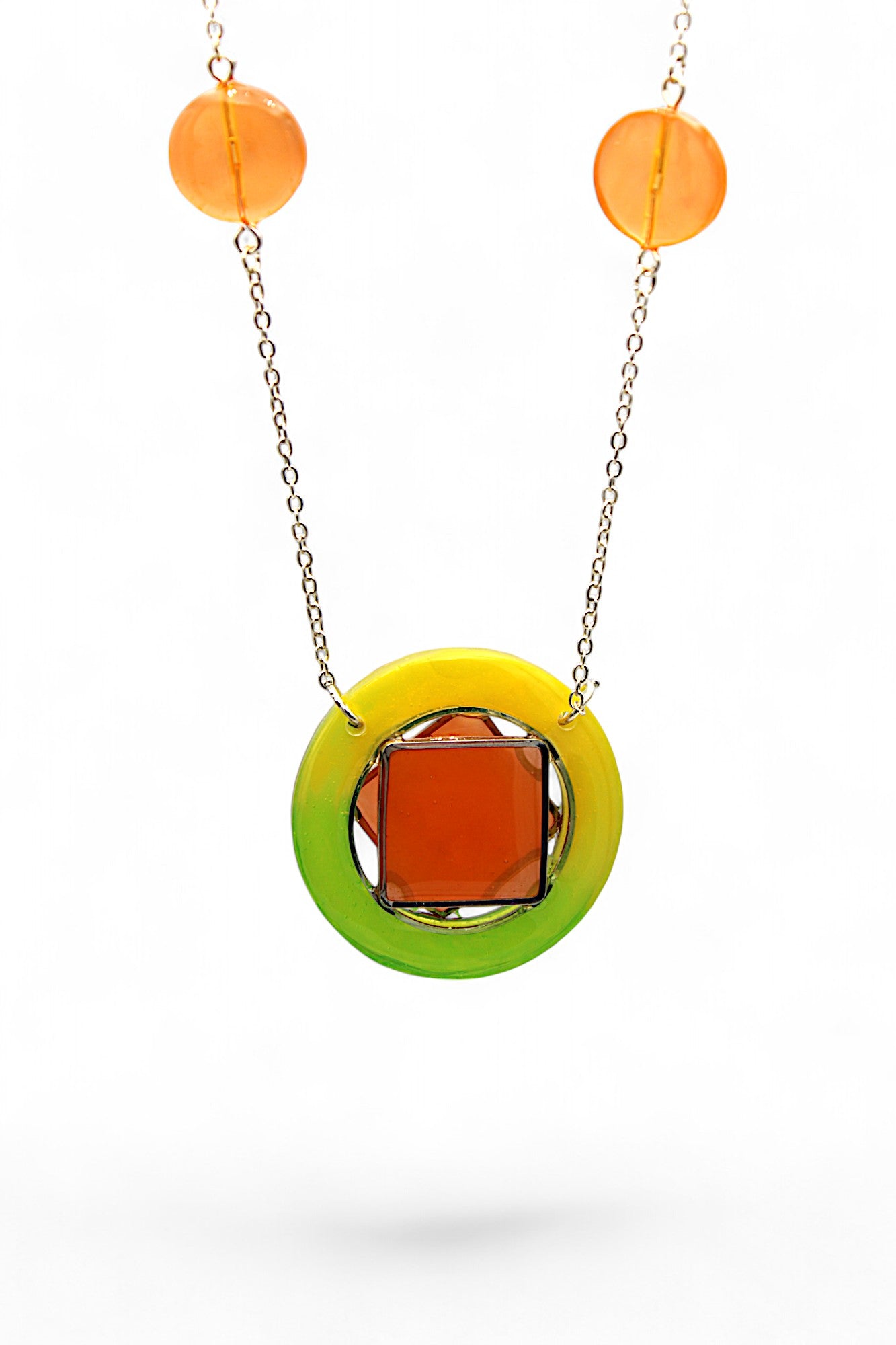 Collier de 74 cm avec cercles en résine orange et pendentif cercle en résine mangue et résine verte
