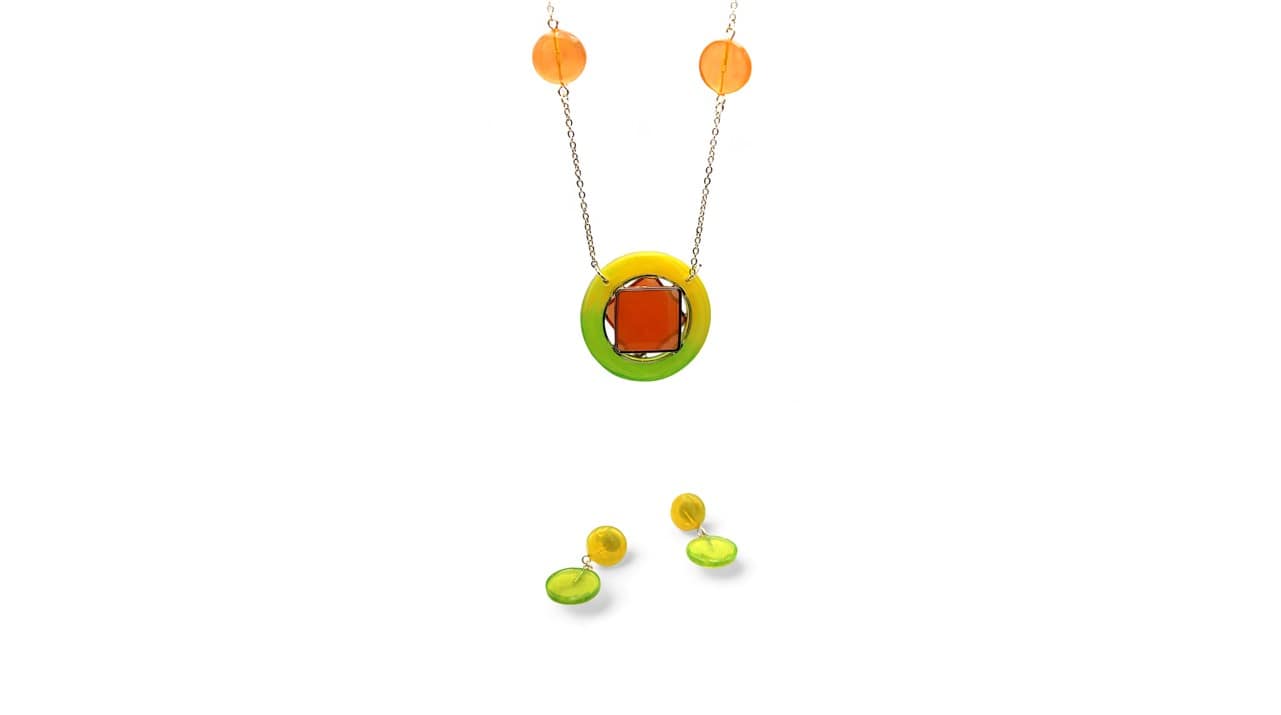 Cette parure 2 pièces en acier inoxydable argenté est le parfait accessoire pour un look estival et coloré. Le collier de 74 cm est agrémenté de cercles en résine orange, d'un pendentif cercle de 4 cm de diamètre en résine mangue et résine verte, avec au centre des carrés de résine orange. Les clous d'oreilles pendants mesurent 4 cm et sont composés d'un cercle de 1 cm de diamètre en résine mangue et un cercle de 1,8 cm de diamètre en résine verte.