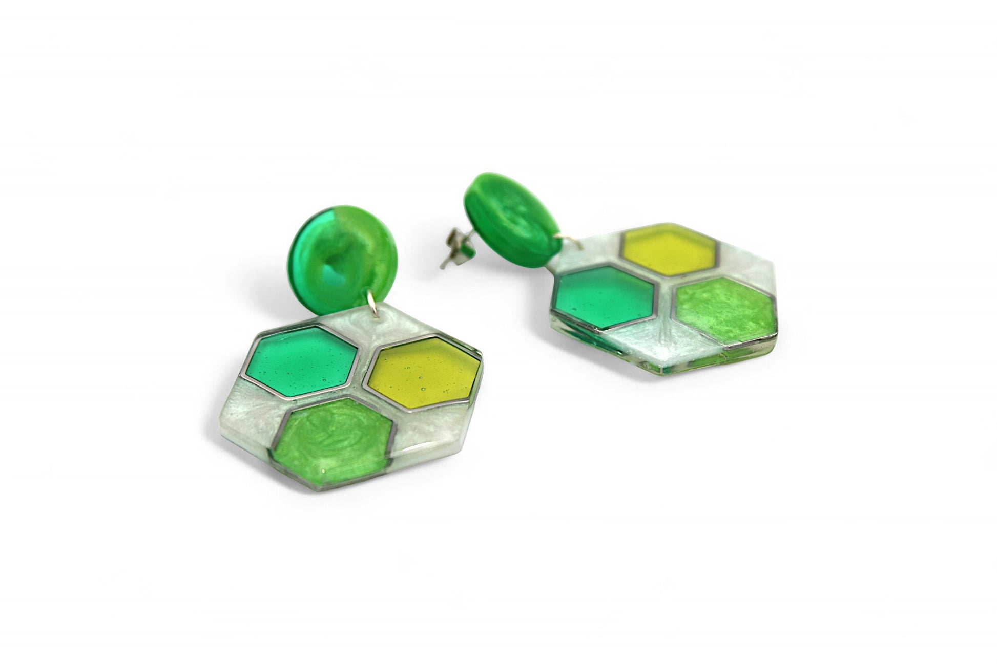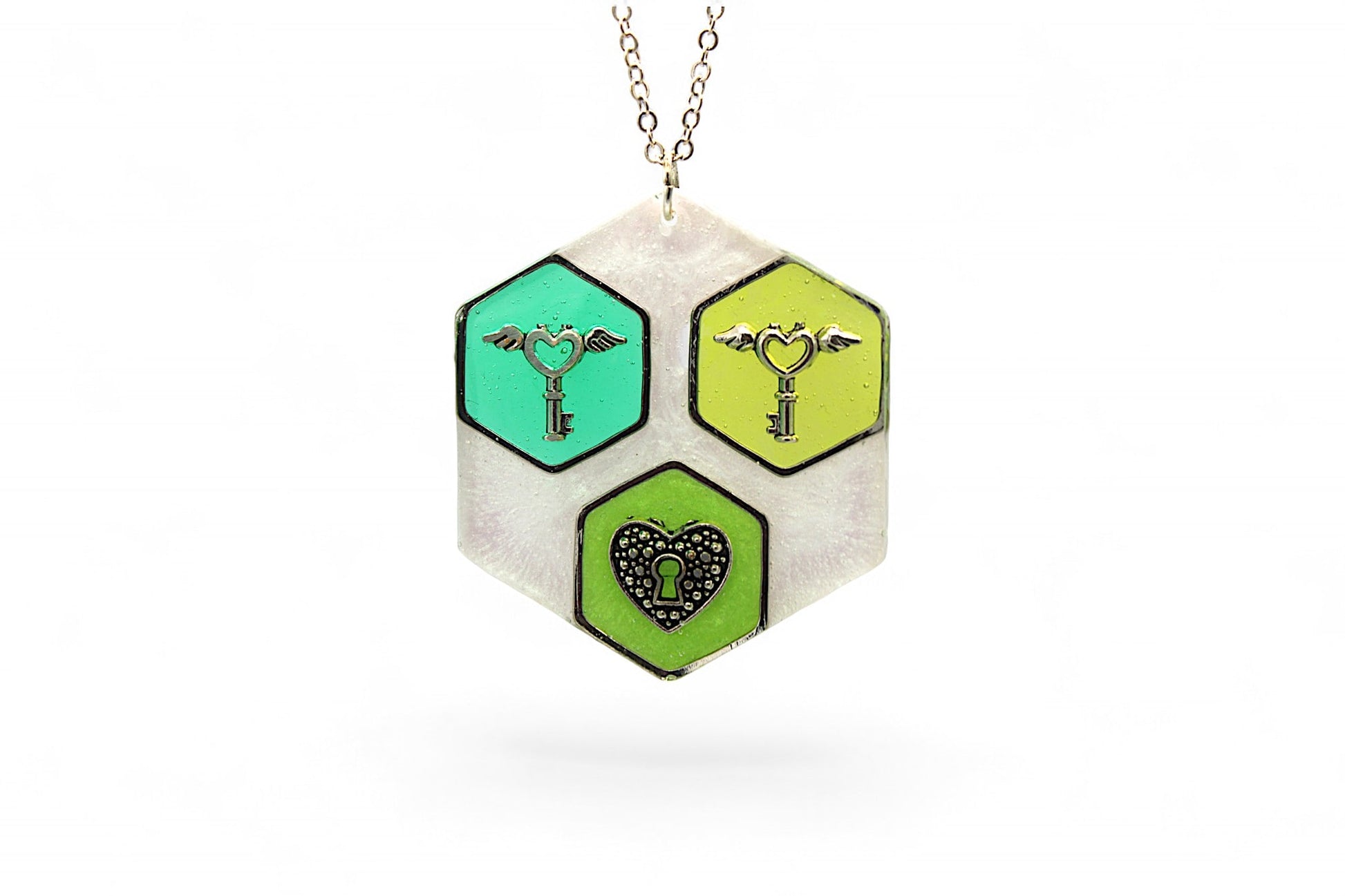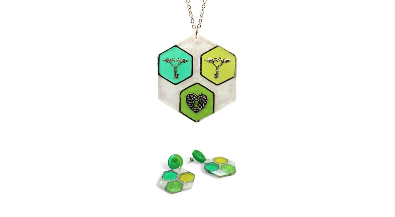 Cette parure en acier inoxydable argenté se compose d'un collier de 58 cm et de clous d'oreilles pendants de 5,8 cm. Le pendentif du collier est un hexagone de 5 cm sur 4,5 cm en résine blanc nacré pigmenté de vert, avec deux hexagones vert et vert clair et une breloque "clé ailée" argentée, ainsi qu'un hexagone vert nacré avec une breloque argentée "cadenas coeur". Les clous d'oreilles sont également des hexagones en résine blanc nacré pigmenté de vert, avec trois hexagones en résine verte, verte clair ou vert clair nacré.