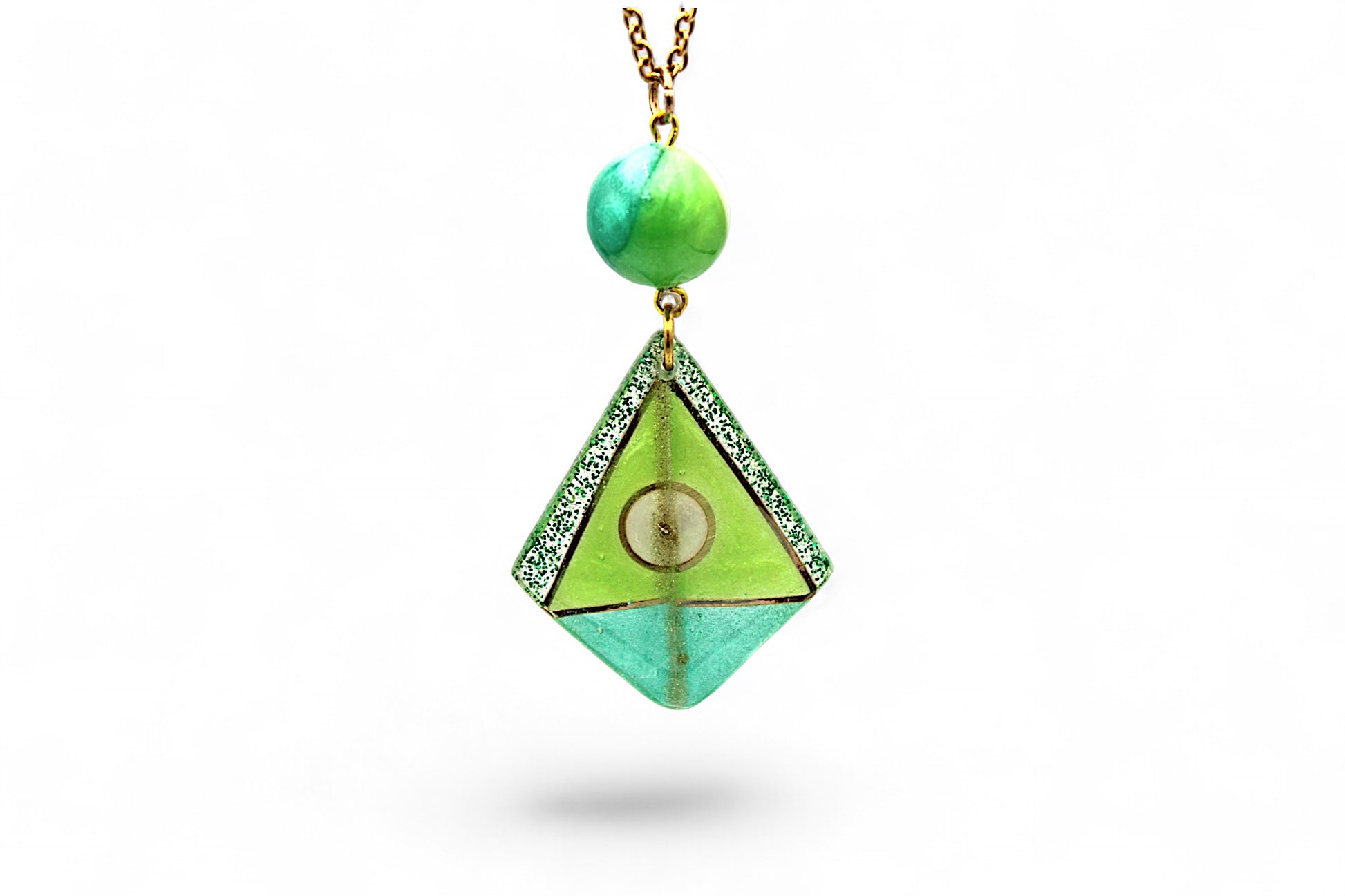 Cette parure 2 pièces se compose d'un collier et de pendants d'oreilles en acier inoxydable doré. Le collier est composé d'un pendentif en forme de losange de 4 cm sur 3,5 cm en résine vert foncé nacré et paillettes vertes, avec un insert triangle en résine vert clair et un cercle central en résine blanc nacré pigmenté de vert. Le pendentif est surmonté d'une sphère de 1 cm de diamètre en résine vert clair nacré, vert foncé nacré et blanc nacré pigmenté de vert. Les pendants d'oreilles sont des triangles de 4 cm sur 1,7 cm en résine vert foncé nacré et paillettes vertes, avec un triangle en résine vert clair nacré et un demi-cercle en résine blanc nacré pigmenté de vert.