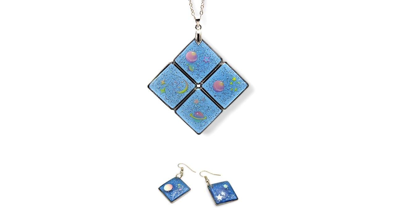 La parure galaxie est composée d'un collier de 56 cm et de boucles d'oreilles assorties. Le collier est orné d'un pendentif en acier inoxydable argenté de 4 cm sur 4 cm, tandis que les boucles d'oreilles ont des pendants de 4,5 cm. Les motifs principaux de cette parure sont des carrés de 2 cm sur 2 cm en résine bleue, agrémentés de stickers représentant des planètes et des étoiles de couleurs vives, créant ainsi un univers galactique fascinant.