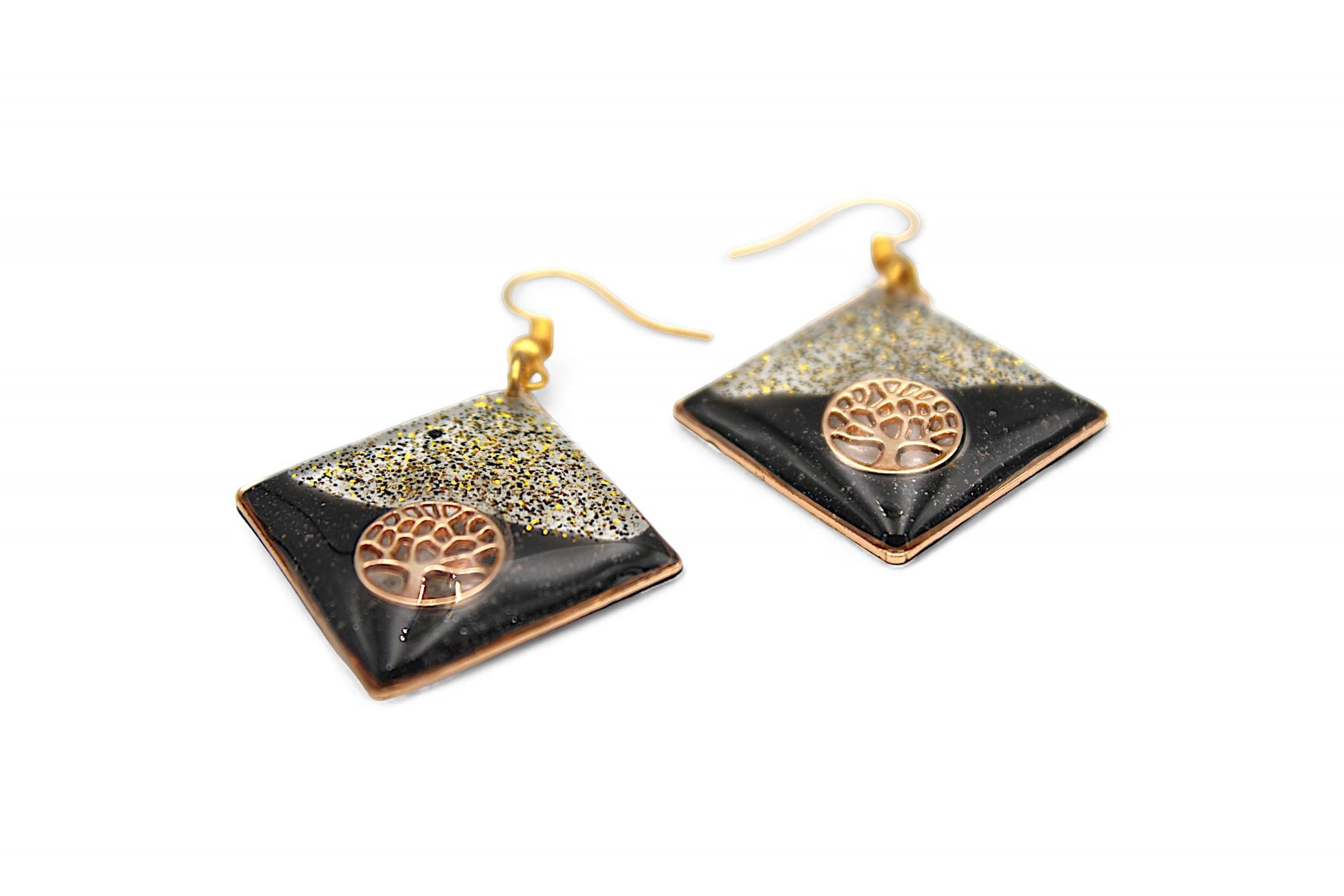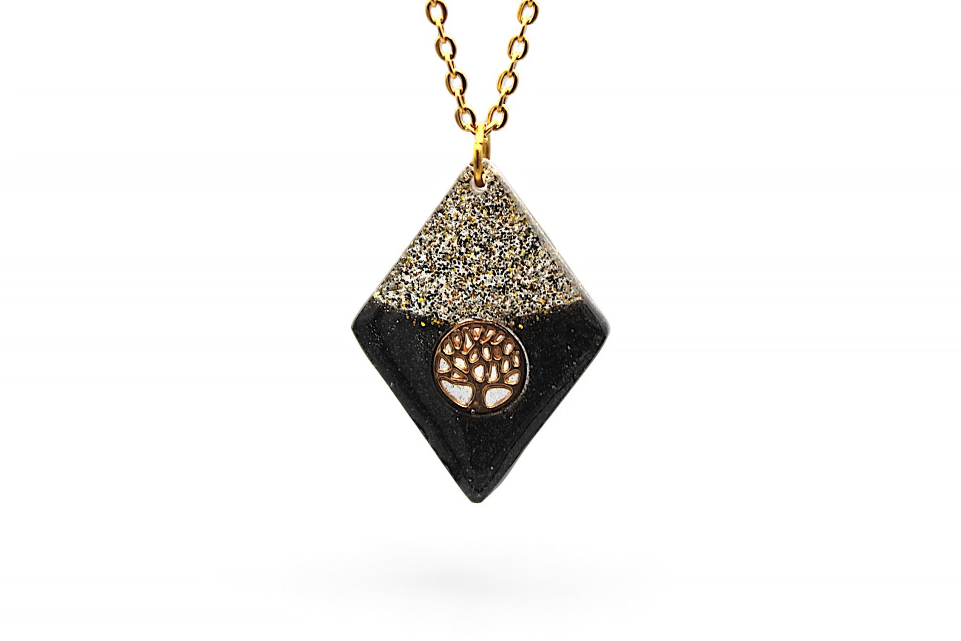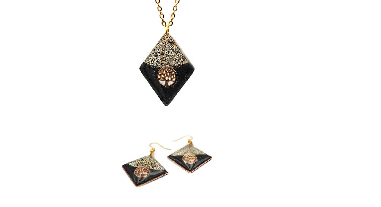 Cette parure en acier inoxydable doré se compose d'un collier de 56 cm et de pendants d'oreilles de 5,5 cm. Le pendentif du collier est un magnifique losange de 4 cm sur 3 cm, réalisé en résine noire et transparente avec des paillettes noires et dorées. Il comporte en son centre une breloque arbre de vie dorée. Les pendants d'oreilles sont quant à eux des carrés de 2,5 cm sur 2,5 cm, également en résine noire et transparente avec des paillettes noires et dorées, et une breloque arbre de vie dorée.