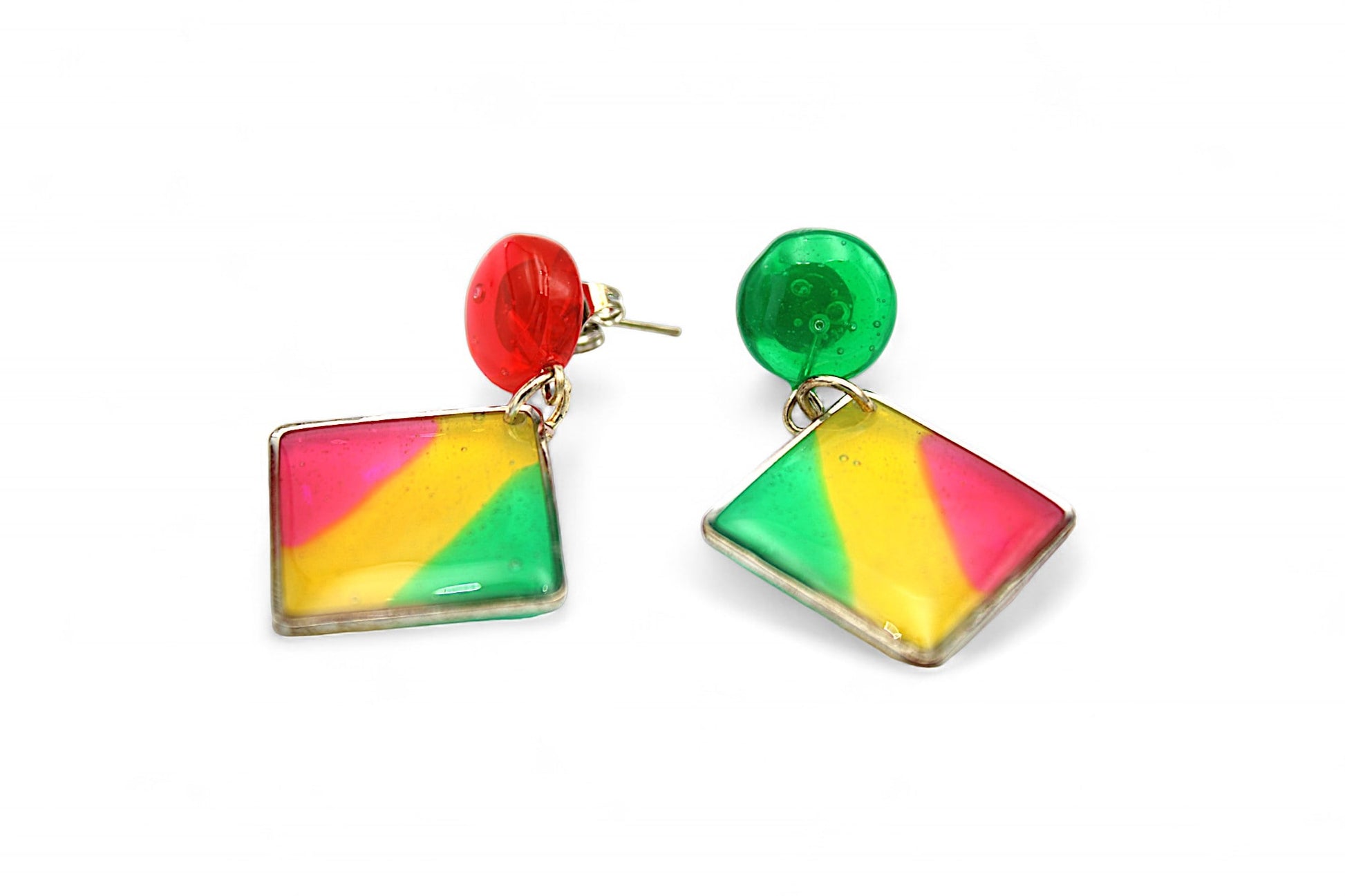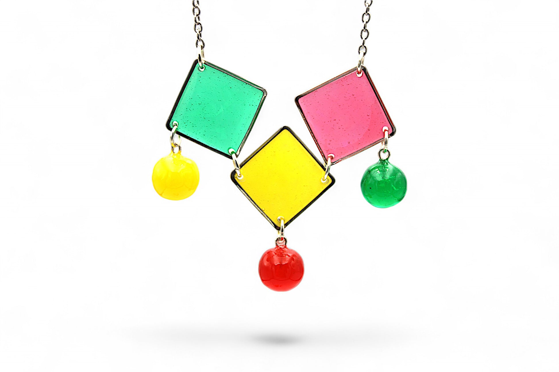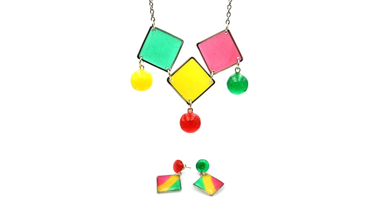 Parure de bijoux en acier inoxydable argenté comprenant un collier mesurant 58 cm avec un pendentif composé de 3 carrés en résine verte, jaune et rouge surmontant une sphère en résine jaune, rouge et verte, ainsi que des clous d'oreilles pendants mesurant 4,5 cm avec un carré en bande résine rouge, jaune et verte.