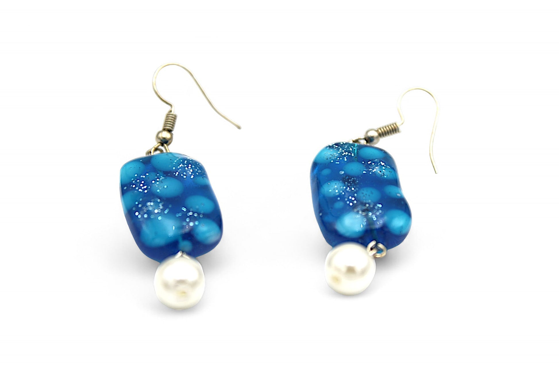 Boucles d'oreilles pendantes en acier inoxydable argent, d'une longueur de 7 cm. Rectangle de 2,5 cm sur 1,5 cm, en résine bleu avec bulles blanches et paillettes argentées. Agrémentées d'une perle blanche.