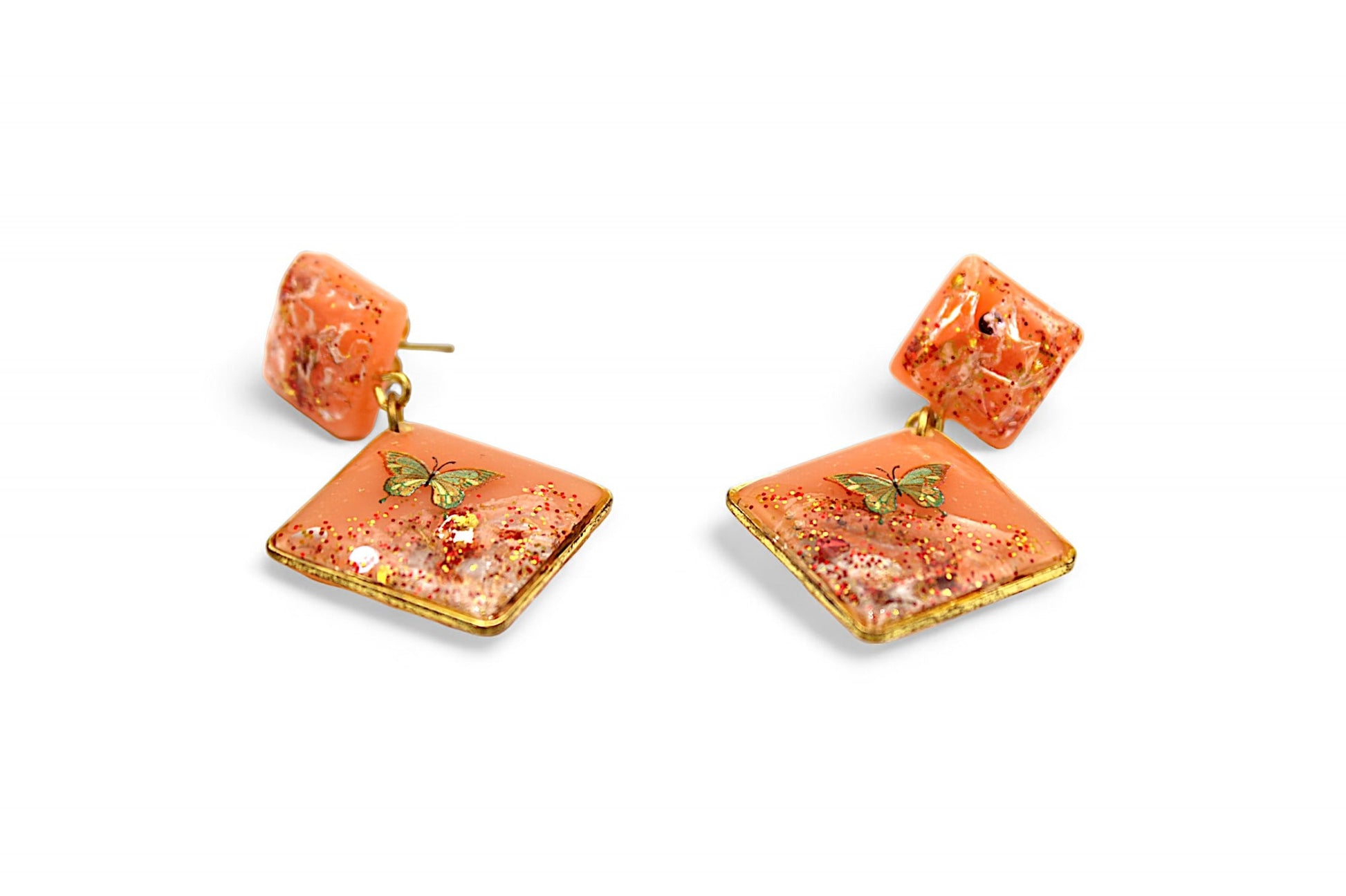 Parure de bijoux composée d'un collier et de clous d'oreilles en acier inoxydable doré. Le collier mesure 59 cm de long avec un pendentif de 5,8 cm de long. Les clous d'oreilles pendants mesurent 4 cm de long. Les bijoux sont ornés de carrés de résine orange, de paillettes oranges et dorées, ainsi que de stickers papillons dans les tons dorés.