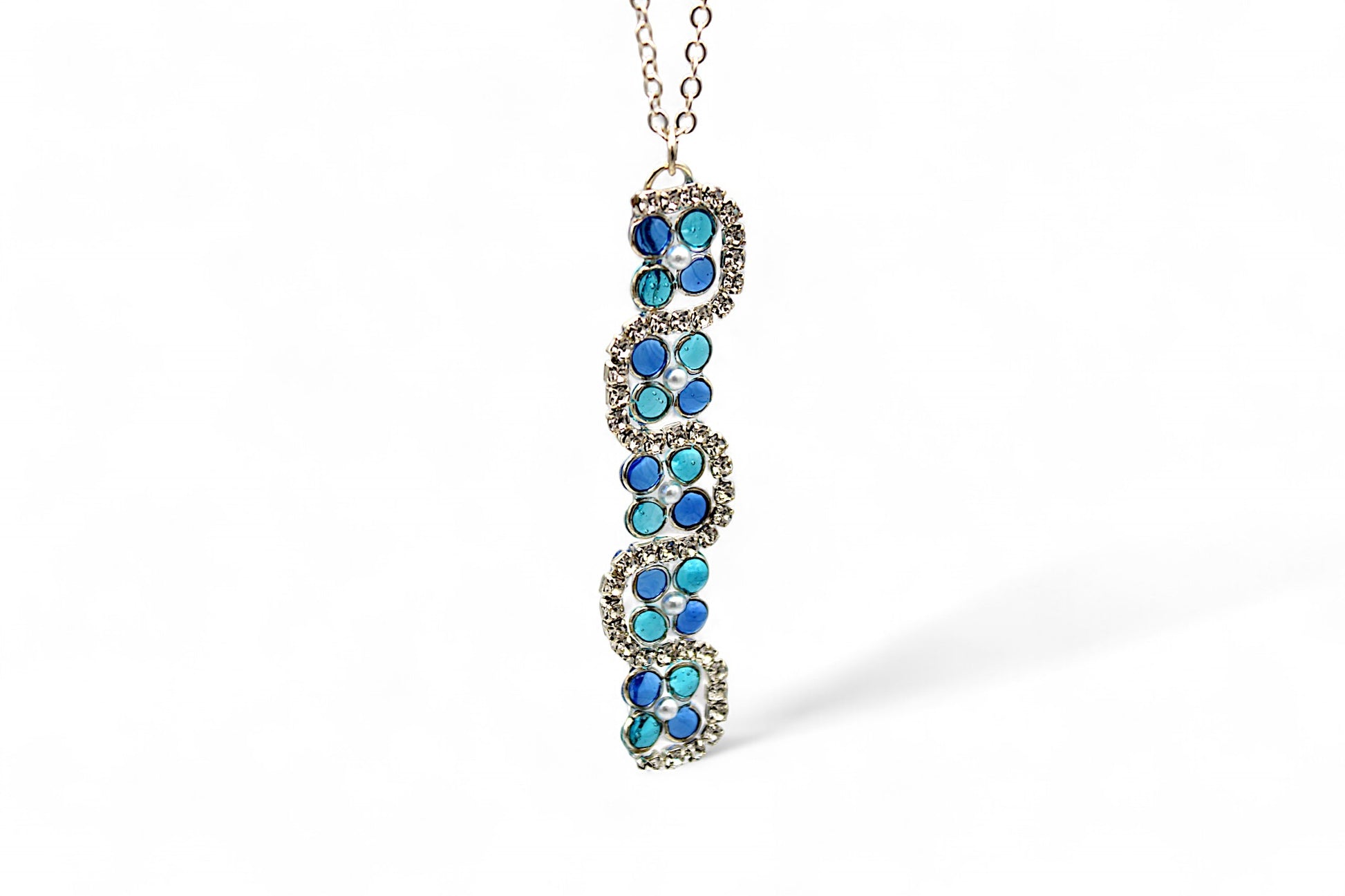 Parure de bijoux en acier inoxydable argenté avec un collier et des boucles d'oreilles assorties. Le collier de 55 cm est agrémenté de 4 fleurs en résine bleu clair et bleu foncé, ornées de strass Swarovski et de perles blanches. Le pendentif, long de 6 cm, est composé de fleurs en résine bleu clair et bleu foncé avec des perles blanches, reliées par une rangée de strass. Les boucles d'oreilles, longues de 7 cm, sont également ornées de fleurs en résine bleu clair et bleu foncé, avec des strass ou des perles blanches.
