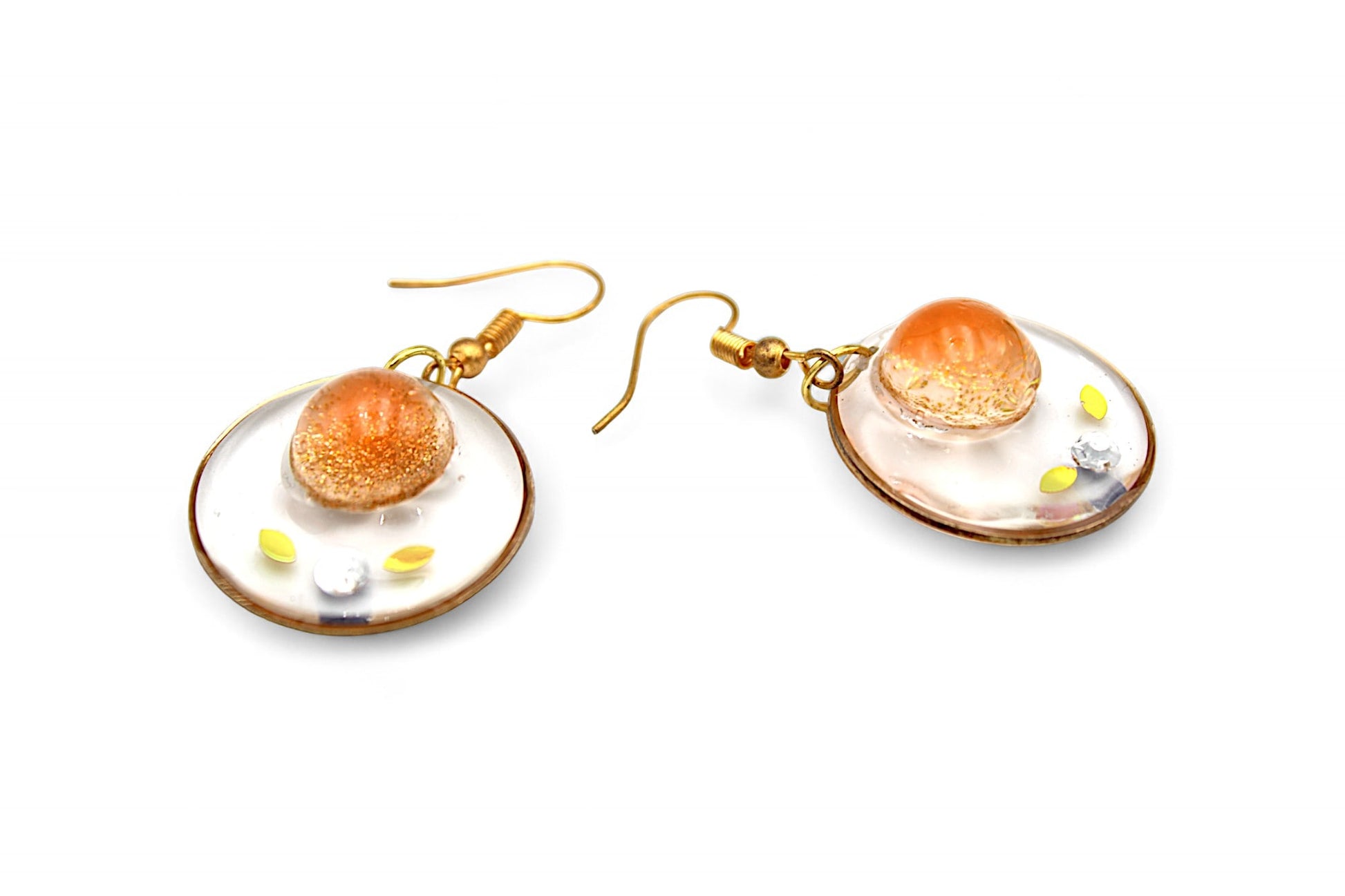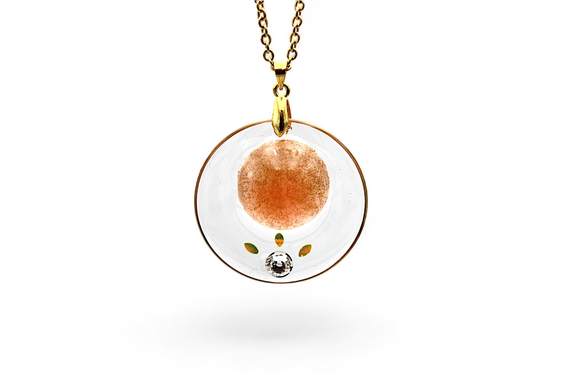 Pendentifs composés de résine transparente avec paillettes et strass Swarovski, ainsi que de résine rose saumon et paillettes oranges et dorées.