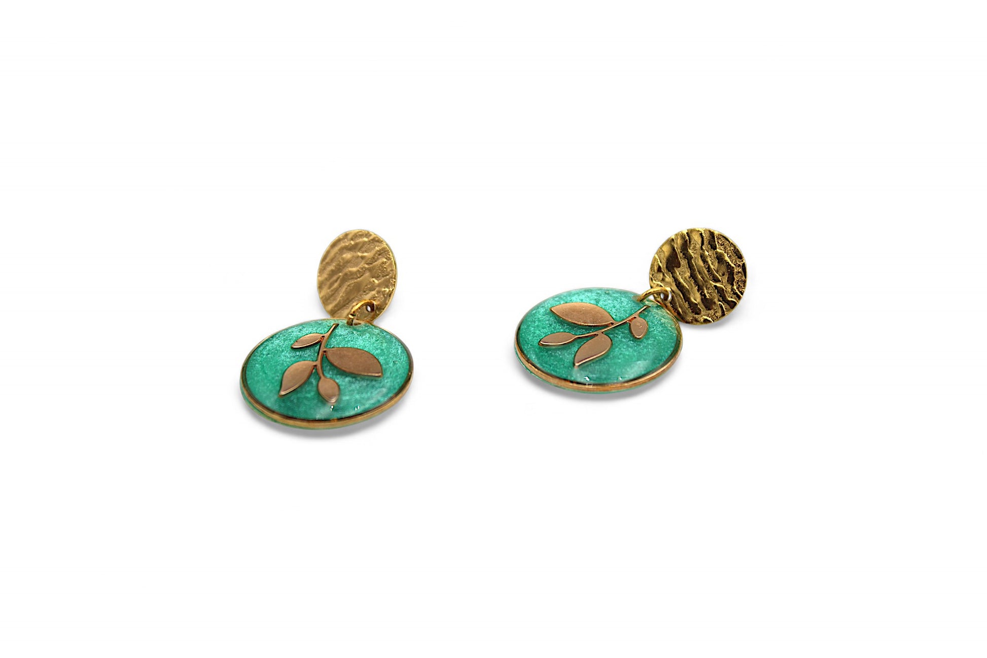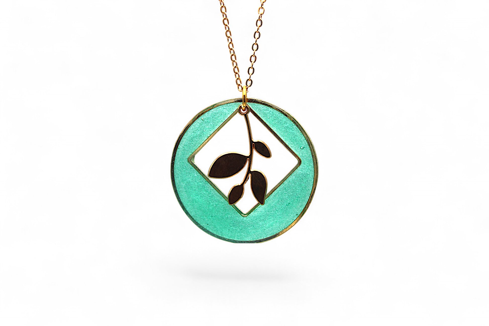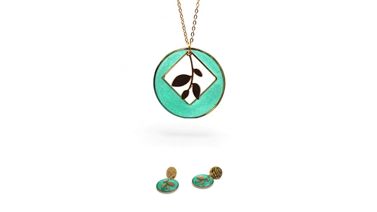 Le collier mesure 56 cm et est orné d'un pendentif cercle de 3,5 cm de diamètre en résine vert nacré avec en insert un carré ouvert avec une breloque feuille. Les clous d'oreilles pendants mesurent 4 cm de long et sont composés d'un cercle de 2,5 cm de diamètre en résine vert nacré décoré de breloques feuille.