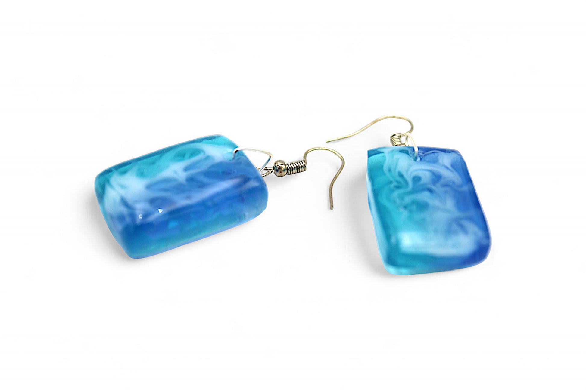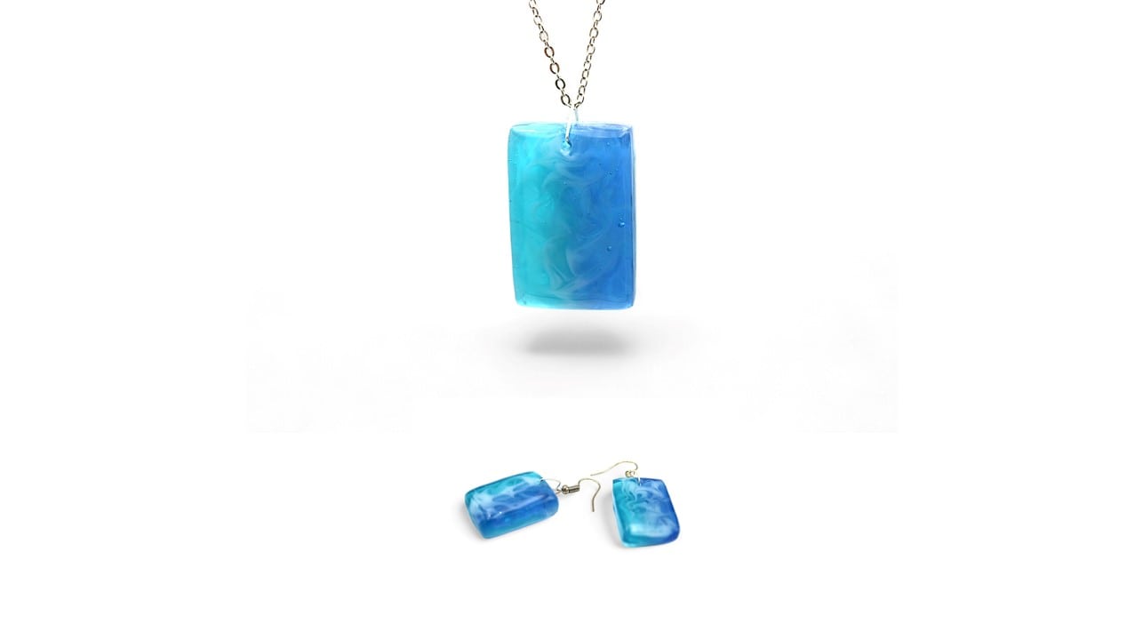 Parure en acier inoxydable argenté composée d'un collier de 56 cm et de pendants d'oreilles de 5 cm. Les pièces sont ornées de rectangles de résine bleue claire et bleue foncée, avec un tourbillon de résine blanche donnant un effet mer.