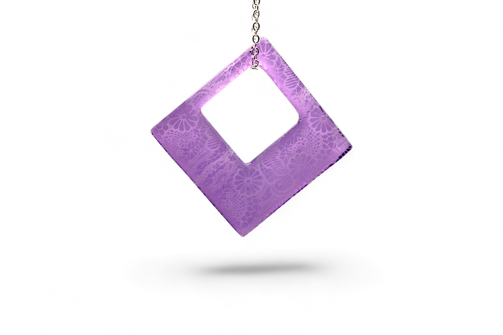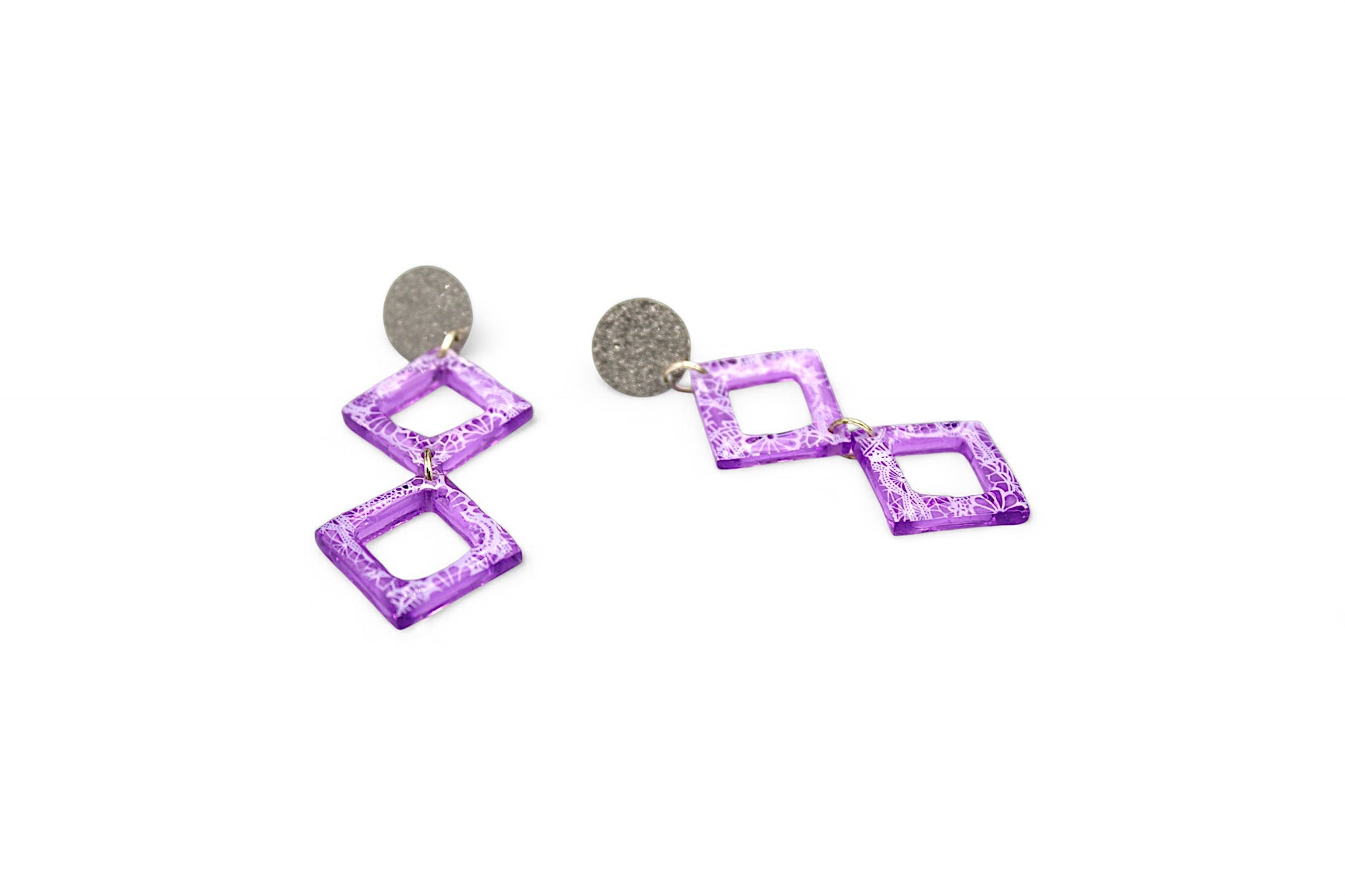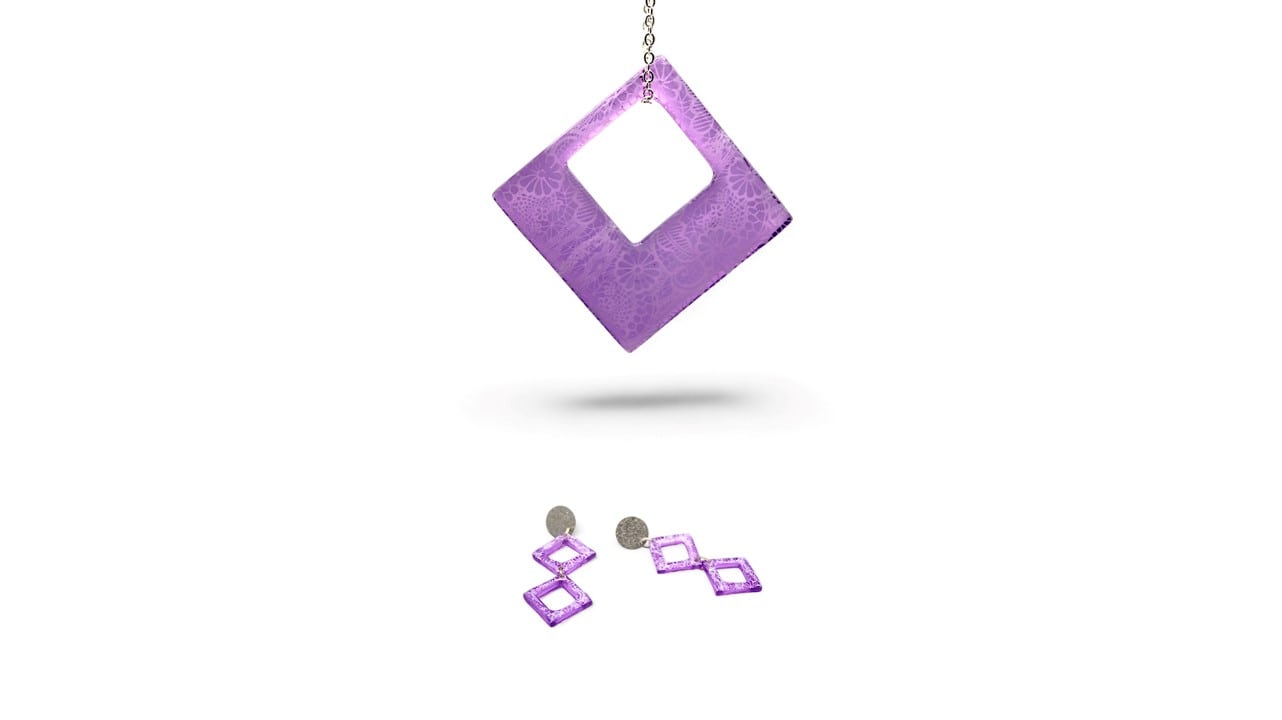 Cette parure est composée d'un collier de 52 cm orné d'un pendentif carré de 4 cm sur 4 cm en résine violette et dentelle blanche, ainsi que de clous d'oreilles pendants de 7 cm de long composés de 2 carrés de 2 cm sur 2 cm en résine violette et dentelle blanche.