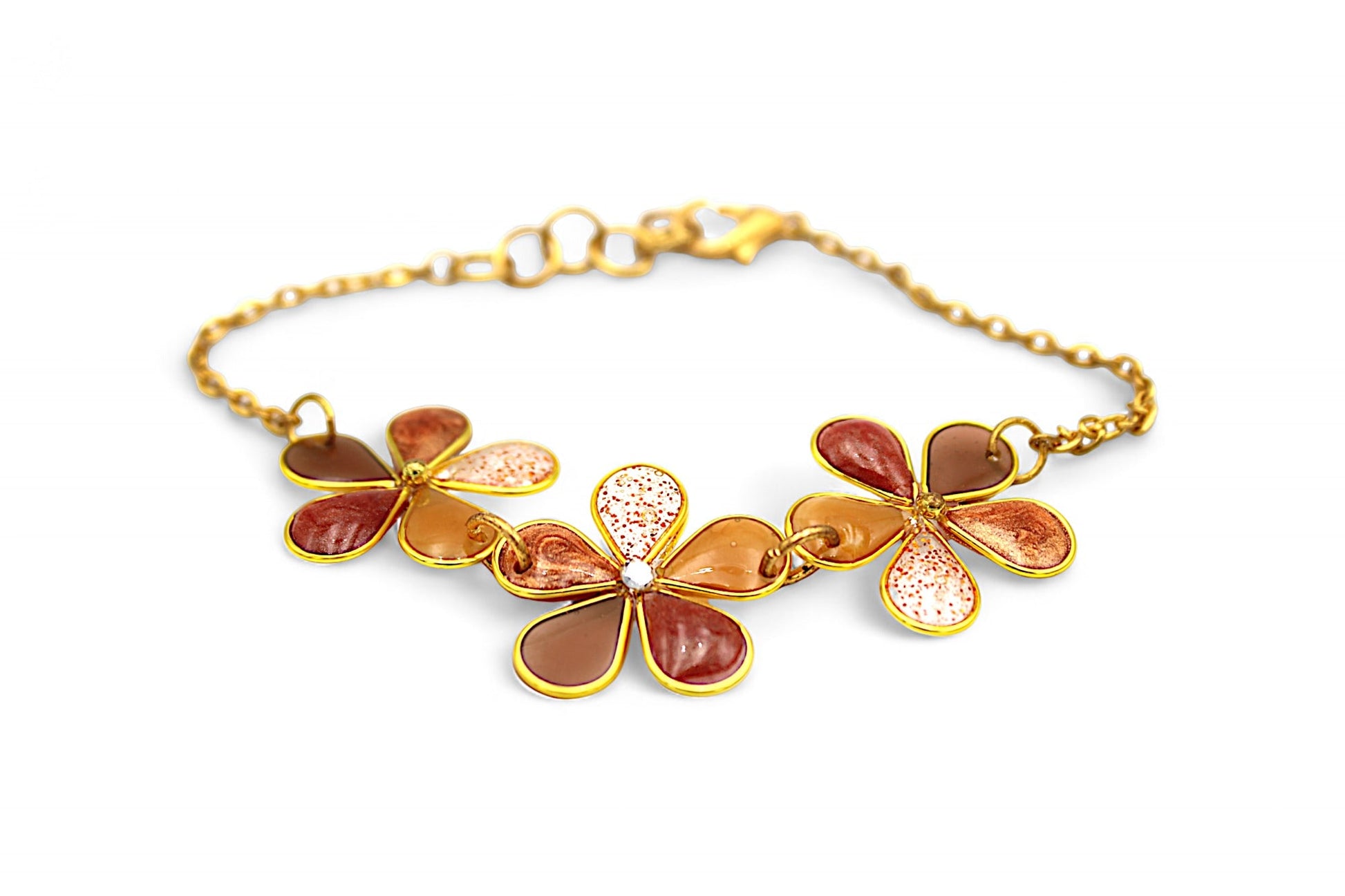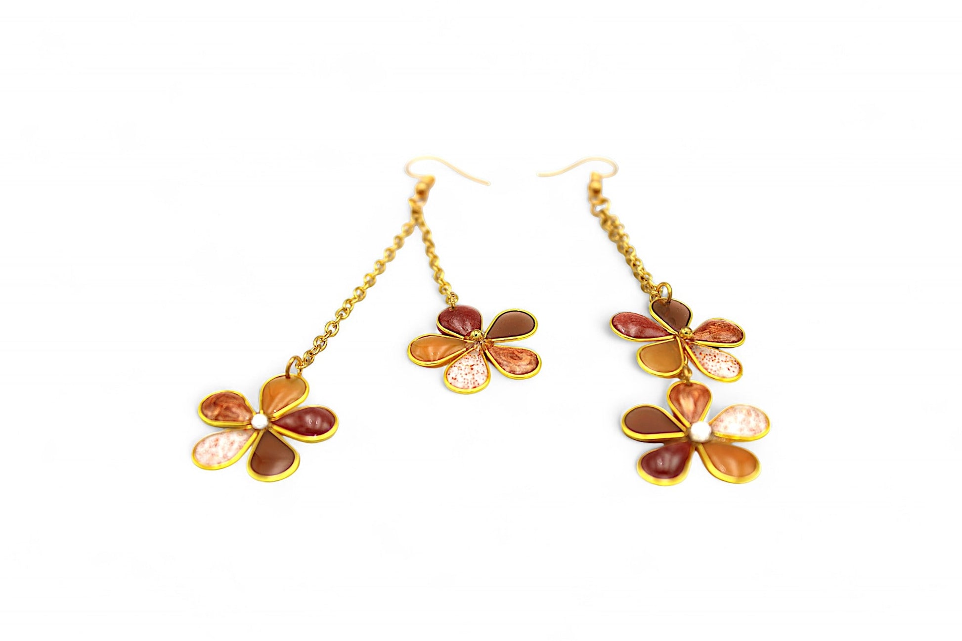 - Les pétales des fleurs sont en résine de différentes teintes (marron, ocre nacré, marron nacré, caramel ou paillettes marrons) et le cœur est agrémenté de strass Swarovski ou de billes dorées pour un éclat maximal.
