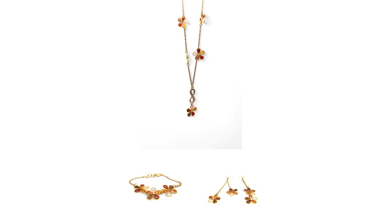Cette magnifique parure de bijoux est composée d'un collier, d'un bracelet réglable et de boucles d'oreilles. Les fleurs qui ornent chaque pièce sont délicates et élégantes, apportant une touche de féminité à votre tenue.
