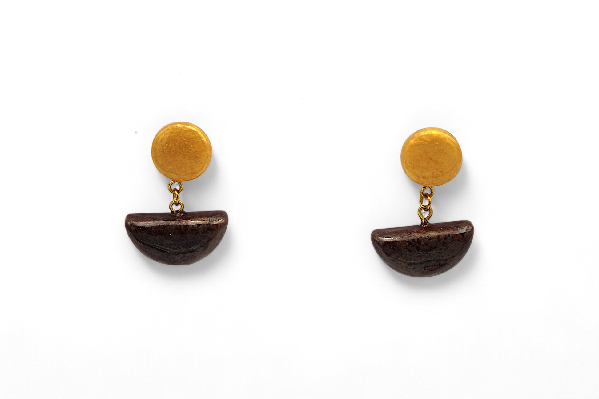 Parure composée d'un collier de 54 cm et de clous d'oreilles assortis. Les pendentif et clous d'oreilles sont des cercles en résine violet nacré avec en leur centre un carré de paillettes violettes.