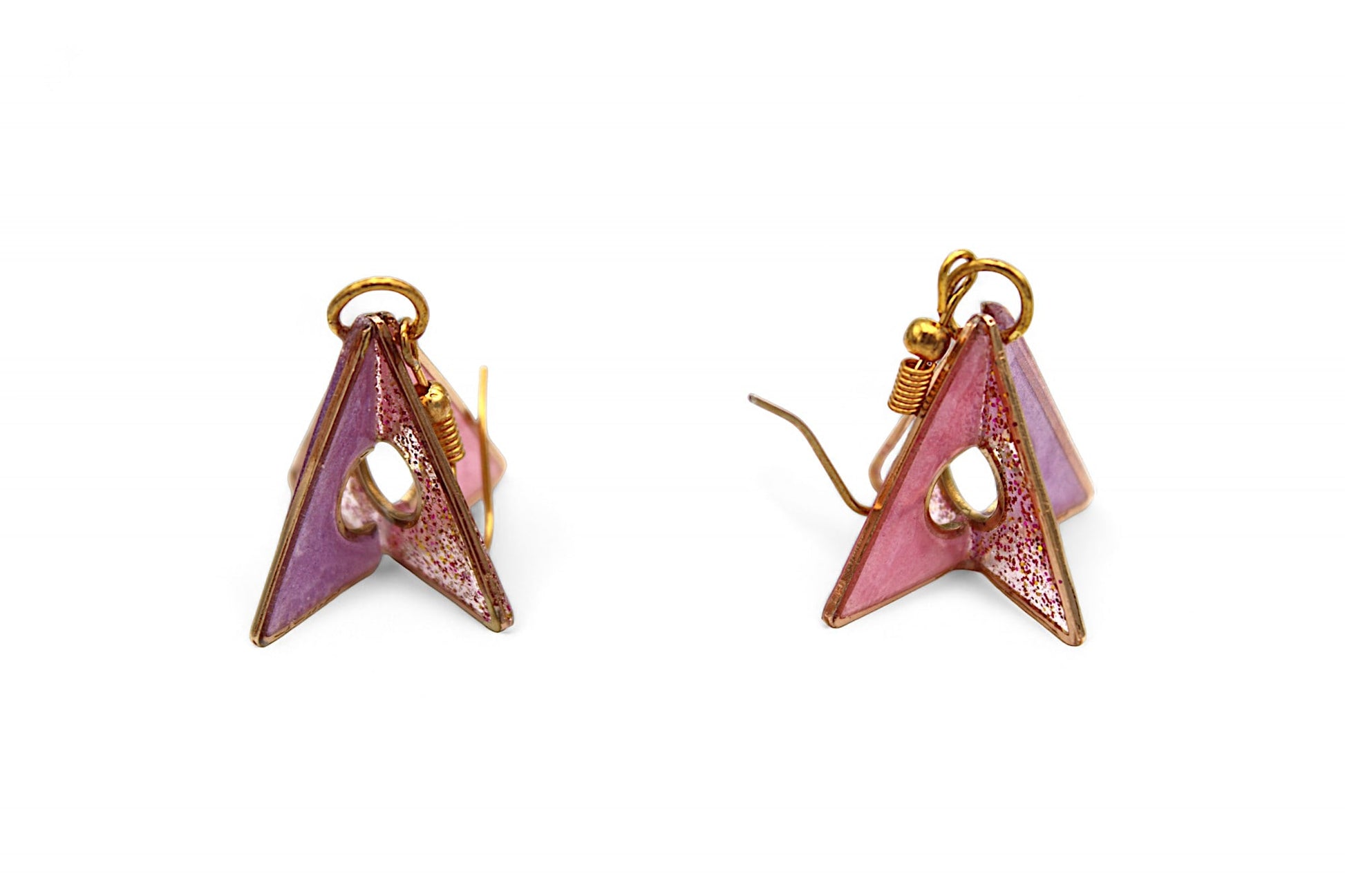 Cette parure 2 pièces en acier inoxydable doré est un ensemble élégant et féminin composé d'un collier de 59 cm et de pendants d'oreilles de 5 cm. Les pyramides en triangle de résine rose nacré, paillettes roses et violet nacré apportent une touche de sophistication et de glamour à votre tenue.