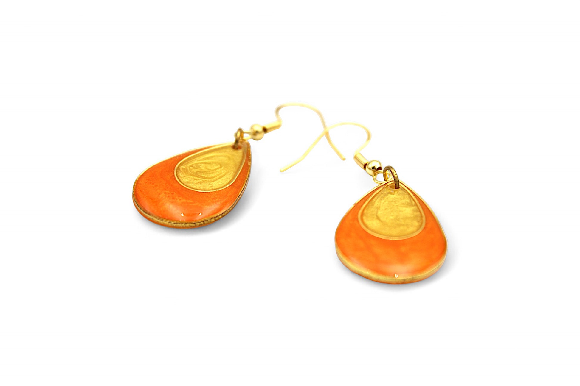 Pendants d'oreilles : gouttes d'eau mesurant 3 cm sur 1 cm en résine orange nacré avec un insert goutte d'eau en résine jaune nacré