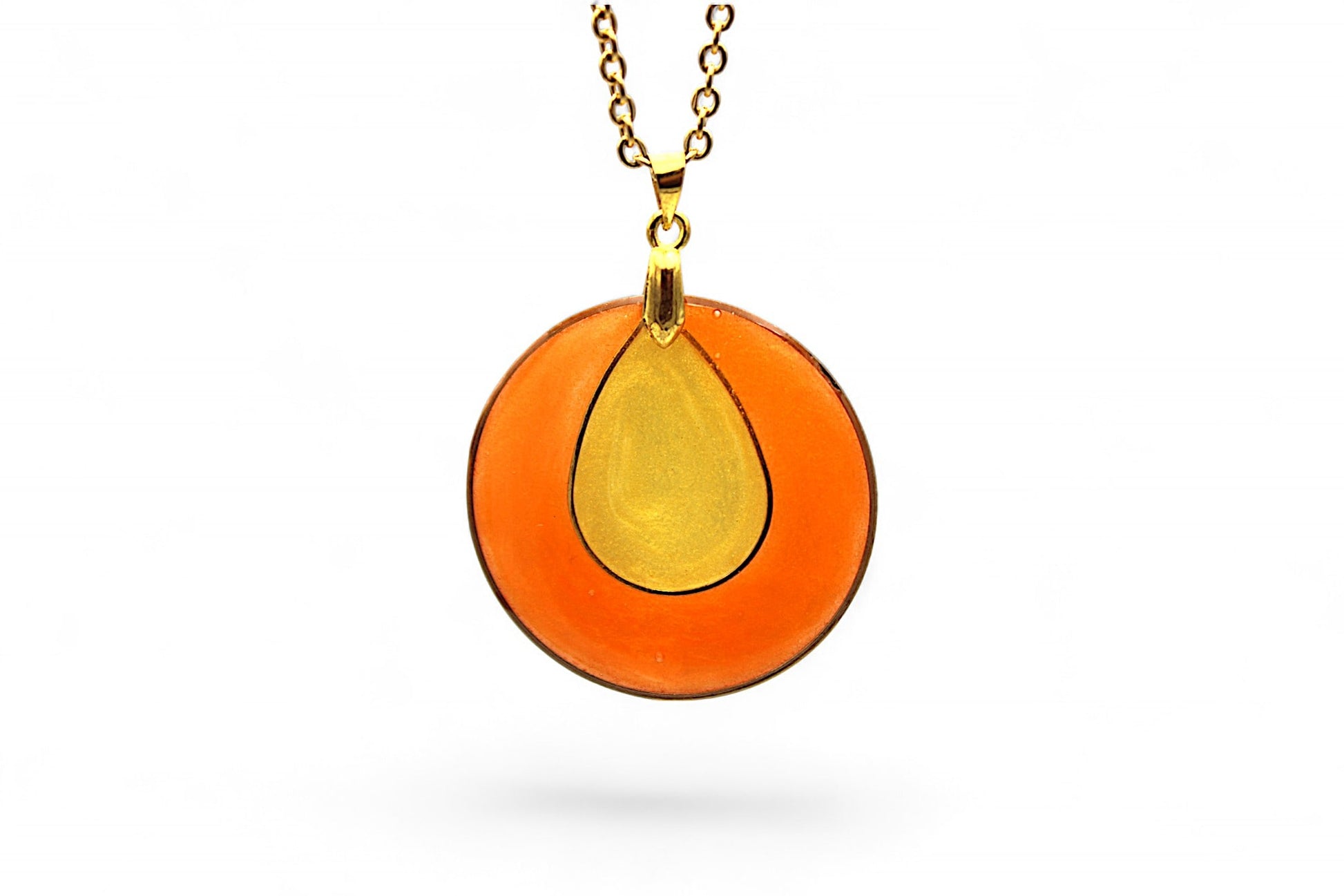 Pendentif du collier : cercle de diamètre 5 cm en résine orange nacré avec un insert goutte d'eau en résine jaune