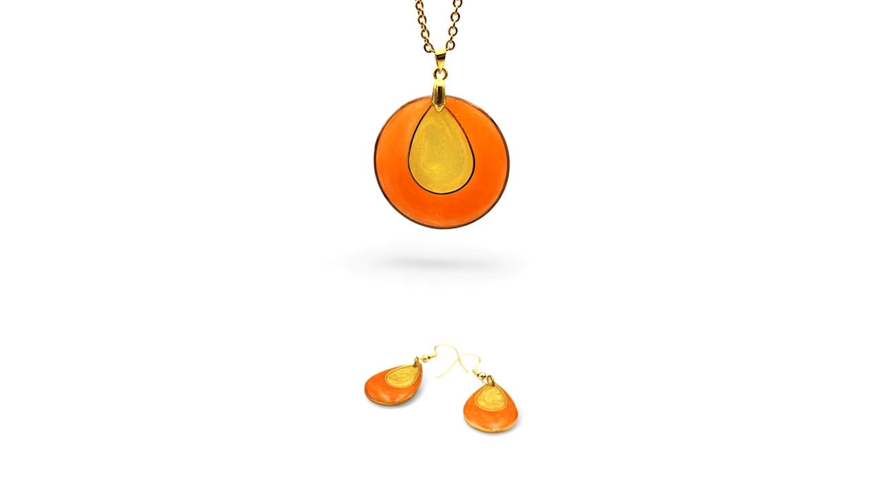 Cette parure comprend un collier de 57 cm et des pendants d'oreilles de 4,5 cm. Le pendentif du collier est composé d'un cercle de diamètre 5 cm en résine orange nacré avec un insert goutte d'eau en résine jaune. Les pendants d'oreilles sont quant à eux composés de gouttes d'eau mesurant 3 cm sur 1 cm en résine orange nacré, également avec un insert goutte d'eau en résine jaune nacré.