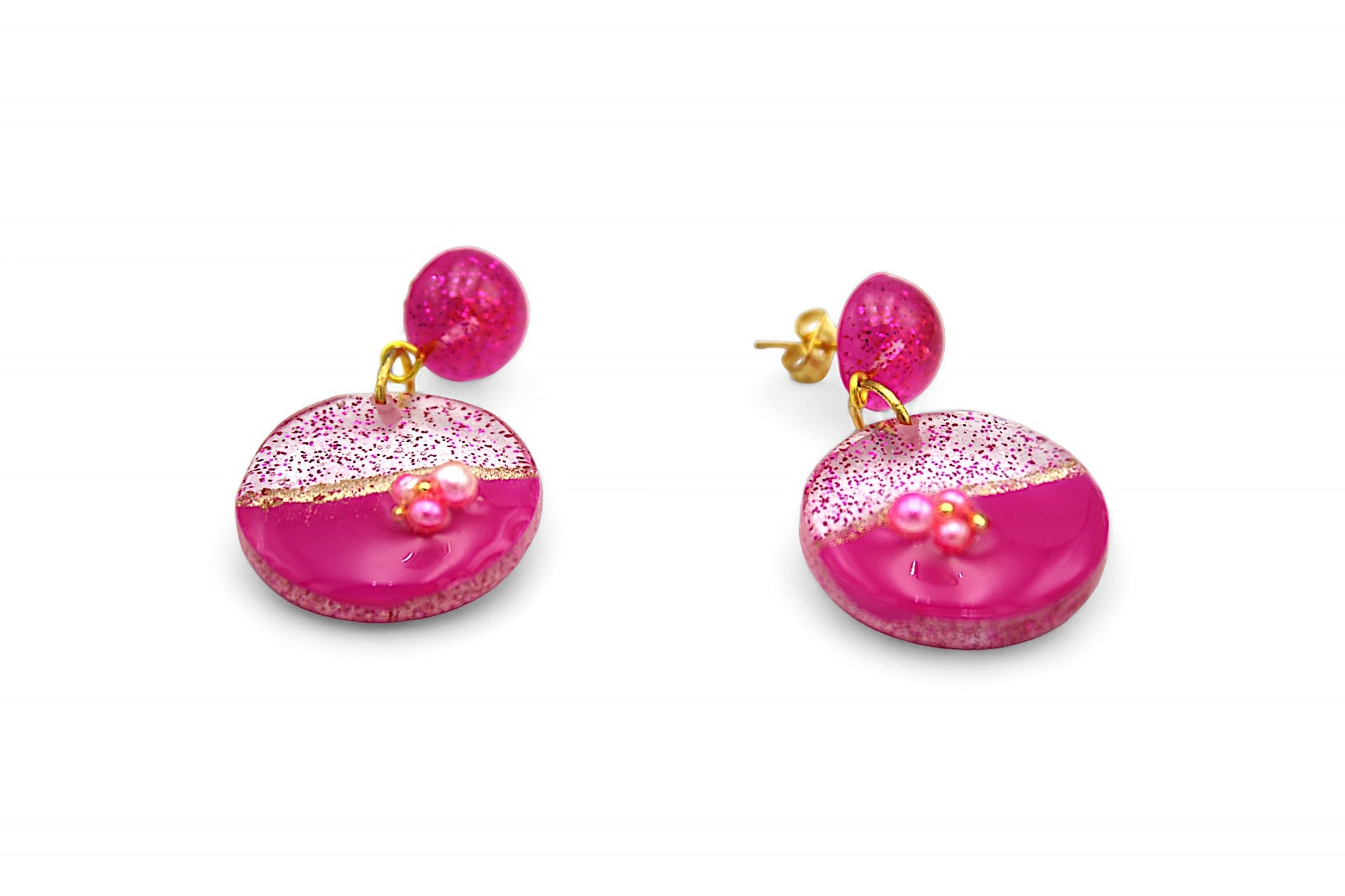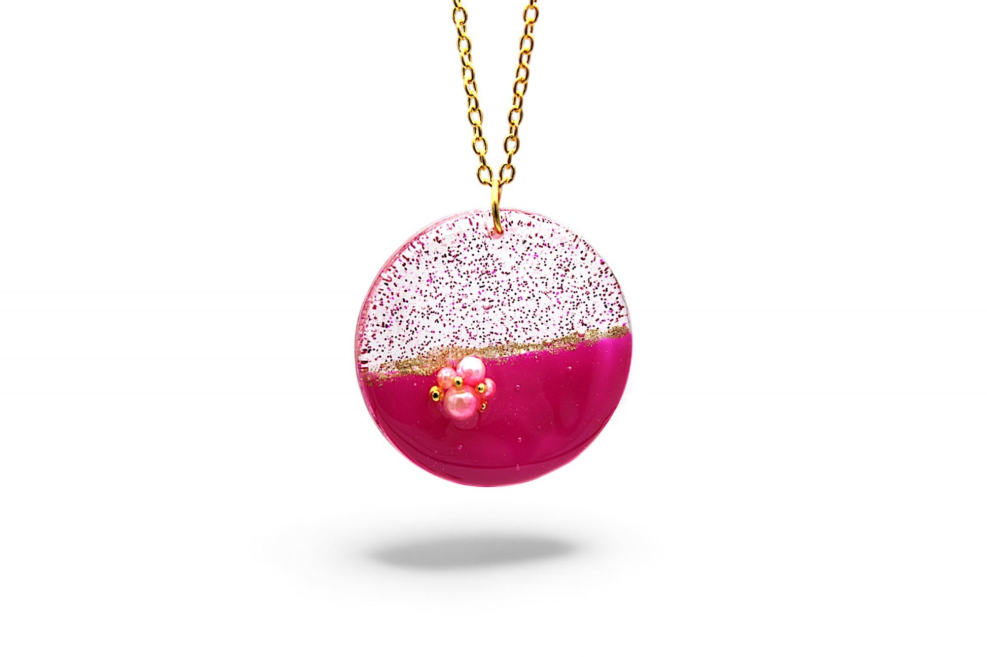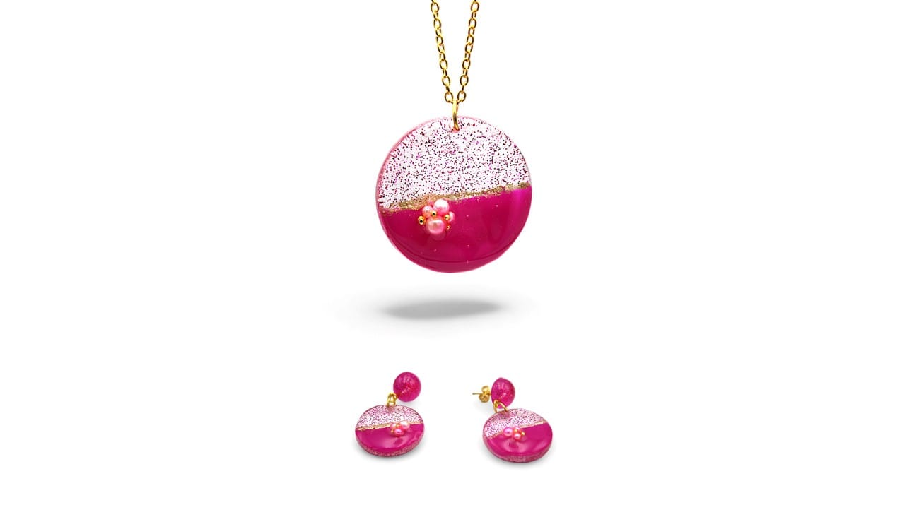 La parure cercles féériques se compose d'un collier de 59 cm et de clous pendants de 4 cm, fabriqués en acier inoxydable doré. Les bijoux sont ornés de cercles divisés en deux par une ligne de paillettes dorées, avec un demi-cercle en résine transparente et paillettes rose, et l'autre demi-cercle en résine rose fuchsia avec des perles blanches et roses, ainsi que des billes dorées. Le diamètre du pendentif est de 4 cm et le diamètre des pendants d'oreilles est de 2,5 cm.